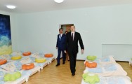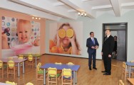 Azərbaycan Prezidenti körpələr evi-uşaq bağçasının binasının rəmzi açılışını bildirən lenti kəsdi.