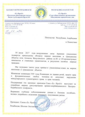 Mənzil-qərargahı Almatı şəhərində olan Türk Xalqları Mədəniyyət Vəqfinin bəyanatında bildirilir ki, mülki əhaliyə və mülki obyektlərə birbaşa və qəsdən hücumlar, beynəlxalq humanitar hüquqa və insan haqlarına, xüsusilə Cenevrə konvensiyalarına və uşaqların hüquqlarına ziddir. Qazaxıstanda akkreditə olunmuş Birləşmiş Millətlər Təşkilatının nümayəndəliyinə, “Qırmızı Xaç” “UNICEF” Beynəlxalq uşaq təşkilatına, ATƏT-in Astana ofisinə ünvanlanmış bəyanatda deyilir ki, baş vermiş hadisənin məsuliyyəti tam şəkildə Ermənistanın siyasi-hərbi rəhbərliyinin üzərinə düşür.