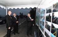 Prezident İlham Əliyev əsaslı şəkildə yenidən qurulmuş avtomobil yolunun rəmzi açılışını bildirən lenti kəsdi.