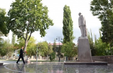 Dövlətimizin başçısı əvvəlcə İsmayıllı şəhərində ulu öndər Heydər Əliyevin abidəsini ziyarət etdi, önünə gül dəstəyi qoydu.