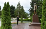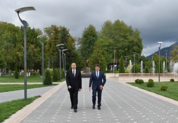 Dövlətimizin başçısı əvvəlcə xalqımızın ümummilli lideri Heydər Əliyevin Qəbələ şəhərinin mərkəzindəki abidəsini ziyarət edərək önünə gül dəstəsi qoydu.