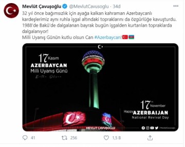 Türkiyənin xarici işlər naziri Mövlud Çavuşoğlu 17 noyabr – Milli Dirçəliş Günü münasibətilə Azərbaycan xalqına səmimi təbriklərini çatdırıb.