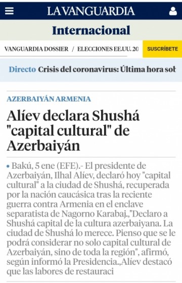 İspaniyanın EFE informasiya agentliyinin saytında, "La Vanguardia" qəzetində "İlham Əliyev Şuşanı Azərbaycanın mədəniyyət paytaxtı elan edib" sərlövhəli məlumat dərc edilib.