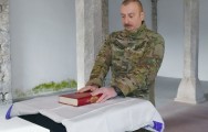 Onların ürəyində nə qədər düşmənçilik hissi olmalı idi ki, bax, bu vəhşiliyi törətsinlər. Bunu törədən Sarkisyan-Koçaryan cütlüyüdür. Bizim şəhərlərimizi bu günə salan Sarkisyan-Koçaryan cütlüyüdür. Quldurları, Xocalı cəlladlarını, özündən yalançı qəhrəman düzəldənləri biz məhv etmişik. Onların ordusunu biz məhv etmişik. Şuşanı onların ordusunun əlindən biz geri almışıq, qəhrəmanlıq göstərərək, sıldırım qayalardan qalxaraq. Yüngül silahlarla, bıçaqlarla toplara, tanklara qarşı vuruşaraq məhv etdik onların ordusunu. Harada idilər onlar? Qaçıb gizlənmişdilər İrəvanda. Biri burnunu soxmuşdu buraya. Amma beş gündən sonra dovşan kimi buradan qaçdı. O birisi, ümumiyyətlə, heç səsini çıxarmırdı. Üçüncüsü də var, müharibə cinayətkarı - Ohanyan, özü də burada doğulub, bizim torpağımızda. Müharibə dövründə guya Şuşanı müdafiə etməyə gəlmişdi. İti qovan kimi qovduq onu. İndi yenə sülənir Ermənistanda. Ağzını açıb çirkin sözlər deyir. Bizə sataşanın aqibəti nə oldu, onu hər kəs gördü. Heç kim unutmasın bu dəmir yumruğu. Düşmənin belini qırdıq. Lazım olarsa, bir daha qırarıq. Koçaryan-Sarkisyan, Azərbaycan xalqının düşmənləri, siz buranı bu günə saldınız. Mən müzəffər Ordunun Baş Komandanı kimi gəlmişəm və burada durmuşam, öz torpağımda durmuşam. Sizin iziniz də, tozunuz da rədd olub buradan və bir daha olmayacaq, heç vaxt olmayacaq.