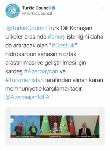 Bununla bağlı Türk Şurasının Tvitter hesabında edilən paylaşımda deyilir: “Türkdilli ölkələr arasında enerji sahəsində əməkdaşlığı daha da artıracaq hidrokarbonat sahəsinin birgə araşdırılması və inkişaf etdirilməsi məqsədilə qardaş Azərbaycan və Türkmənistan tərəfindən alınan qərar Türkdilli Dövlətlərin Əməkdaşlıq Şurası tərəfindən məmnuniyyətlə qarşılandı”.