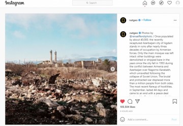“National Geographic”in paylaşımında bir vaxtlar 40 min əhalinin yaşadığı, bu yaxınlarda azad edilmiş Ağdam şəhərinin təxminən 30 il Ermənistanın işğalı altında qalması nəticəsində dağıntılar içində olduğu bildirilir. Qeyd edilir ki, 1993-cü ildə Ermənistan-Azərbaycan münaqişəsi zamanı Ağdam işğal olunduqdan sonra şəhərdə məsciddən başqa bütün tikililər dağıdılıb. Uzun sürən münaqişə bir milyondan çox insanın köçkün düşməsinə səbəb olub.