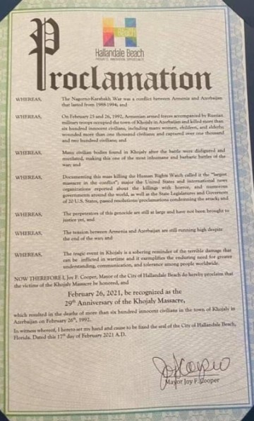 ABŞ-ın Florida ştatının Hallandeyl-Biç şəhərinin meriyası Xocalı soyqırımının 29-cu ildönümü ilə əlaqədar proklamasiya dərc edib.