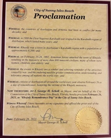 ABŞ-ın Florida ştatının Sanni Ayles Biç şəhərinin meri Corc Skoll Xocalının 29-cu ildönümü ilə əlaqədar 2021-ci il 26 fevral tarixinin Xocalı soyqırımı qurbanlarının anım günü elan edilməsinə dair bəyannamə imzalayıb.