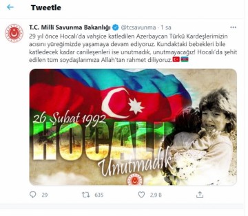 Türkiyə Milli Müdafiə Nazirliyi Xocalı soyqırımı ilə bağlı paylaşım edib