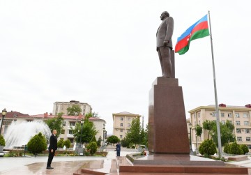 Dövlətimizin başçısı abidənin önünə gül dəstəsi qoydu, Ulu Öndərin xatirəsini ehtiramla yad etdi.
