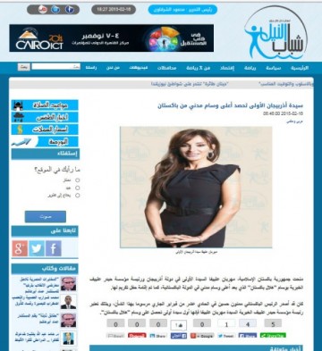 Misirin elektron qəzeti “Shbabalnil” Azərbaycanın birinci xanımı, Heydər Əliyev Fondunun prezidenti Mehriban Əliyevanın Pakistan İslam Respublikasının “Hilal-e Pakistan” ordeni ilə təltif olunması barədə məlumat yayıb.