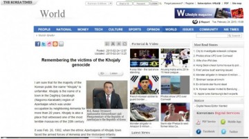 Koreya Respublikasının “The Korea Times” qəzetində nəşr olunan “Xocalı soyqırımı qurbanları yad edilir” başlıqlı məqalədə XX əsrin ən qanlı cinayətlərindən olan Xocalı qətliamı barədə danışılır.