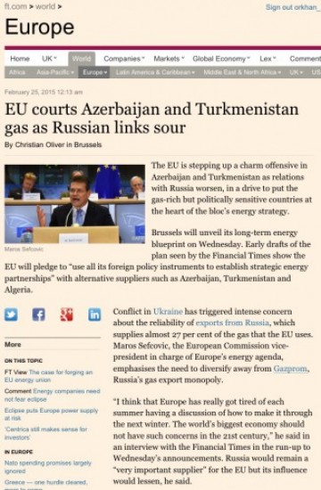 Energetika gündəmi üzrə Avropa Komissiyasının vitse-prezidenti Maroş Şefçoviçin sözlərinə istinad edən qəzet yazır ki, Rusiya Aİ üçün vacib təchizatçı olaraq qalsa da, onun Avropada təsiri azalacaq. M.Şefçoviç bildirib ki, Azərbaycan qazını Avropaya gətirəcək TANAP və TAP layihələrinin 2019-cu ilin sonunadək tamamlanması üçün Aİ bütün qüvvələrini səfərbər edəcək.