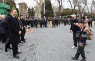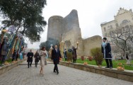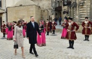 Dövlətimizin başçısı, xanımı və ailə üzvləri əvvəlcə Qız qalasının qarşısındakı meydana gəldilər.