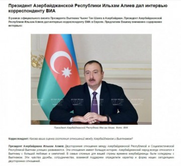 Azərbaycan Respublikasının Prezidenti İlham Əliyev Vyetnam Respublikasının Prezidenti Çıonq Tan Şanqın ölkəmizə rəsmi səfəri çərçivəsində Vyetnam İnformasiya Agentliyinin Avropadakı müxbirinə müsahibə verib. AZƏRTAC-a istinadən həmin müsahibəni təqdim edirik.