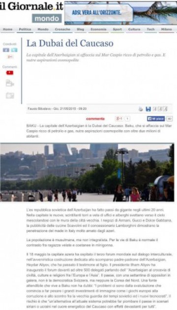İtaliyanın “İl Giornale” qəzetinin saytında Azərbaycanda səfərdə olan jurnalist Fausto Biloslavonun “Qafqazın Dubayı” sərlövhəli növbəti məqaləsi və reportajı yerləşdirilib.