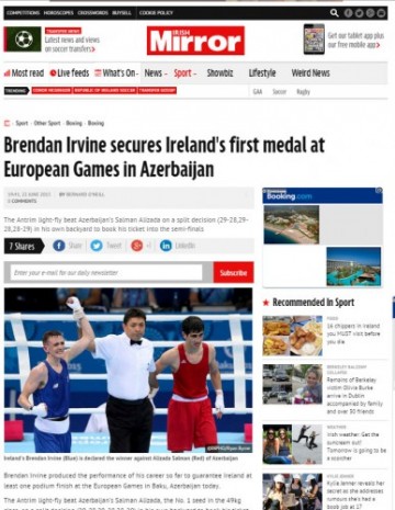 Bu sözləri “irishmirror.ie” saytına müsahibəsində birinci Avropa Oyunlarında iştirak edən irlandiyalı boksçu Brendan İrvin deyib. Boks yarışlarında qalib gələrək medal uğrunda mübarizəsini davam etdirən Brendan birinci Avropa Oyunlarında iştirak etməyin onda qürur hissi yaratdığını vurğulayıb.
