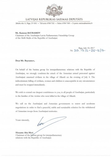 Latviya Seyminin Azərbaycan ilə parlamentlərarası işçı qrupu adından bu ilin iyulun 4-də erməni silahlıları tərəfindən Azərbaycanın Alxanlı kəndinin dinc sakinlərinin qətlə yetirilməsini qətiyyətlə pislədiyimizi bildirmək istərdik.