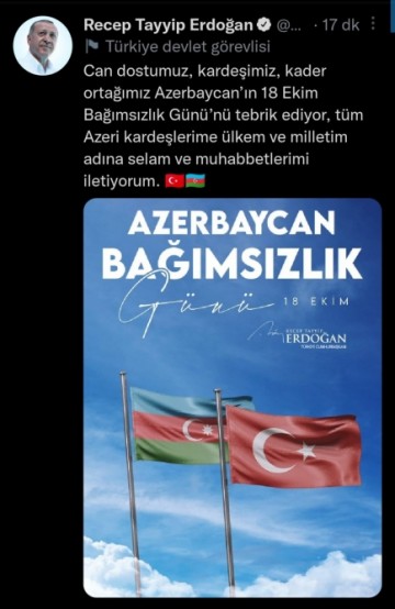 Türkiyə Prezidenti Rəcəb Tayyib Ərdoğan Azərbaycan xalqını Müstəqilliyin Bərpası Günü münasibətilə təbrik edib.